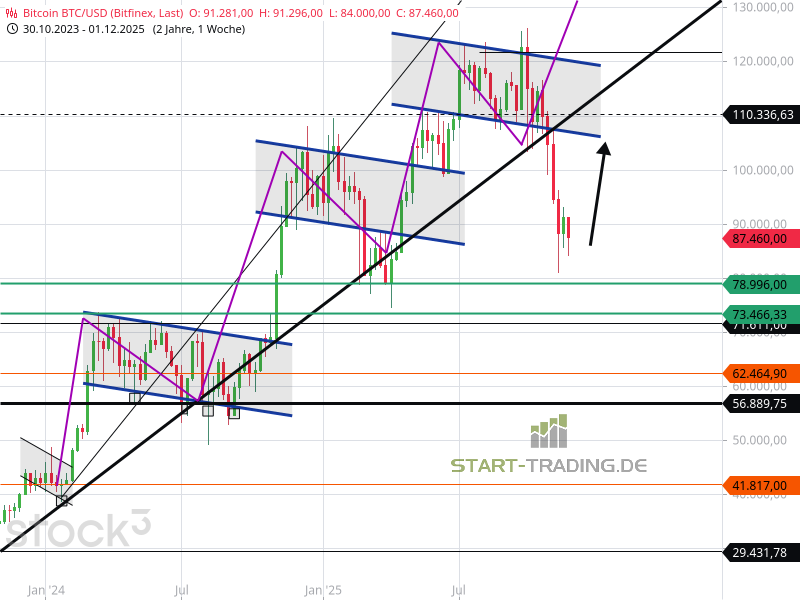 Bitcoin, Wochenchart, Stand 87.460 US-Dollar