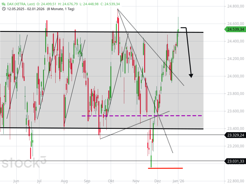 Der DAX beginnt das neue Jahr 2026 fulminant. Es geht in der Spitze hinauf bis 24.676 Punkte. Dieser Spurt am ersten Handelstag des neuen Jahres war vermutlich das Resultat von Gesprächen unter den Familienmitgliedern zu Weihnachten, wo sich ein Großteil über ein 23-prozentiges Kursplus des DAX im Vorjahr erfreute und so den Appetit neuer Aktienkäufer weckte. Doch nachhaltig war der Kursanstieg nicht, denn das Tageshoch wurde wieder verkauft.