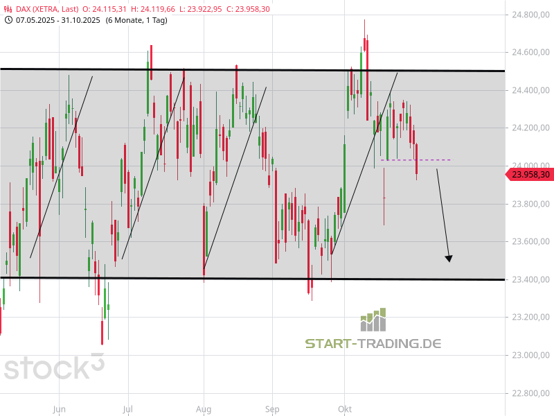 Zu Wochenbeginn an der Börse kann vermutlich wieder der bekannte Monatsbeginn-Effekt beobachtet werden. Neues Geld aus den Sparplänen der Anleger fließt in die Kassen der Fonds, die dann dieses Kapital investieren und so für Wertpapiernachfrage sorgen. Für den Handelsbeginn sind daher leicht steigende Notierungen für den DAX möglich. Doch bereits der Bereich um 24.040 Punkte (lila Linie) stellt ein Hindernis dar, an dem ein solcher Anstieg ins Stocken geraten sollte. Danach orientiert sich der Index wieder nach Süden. Ein neues Verlaufstief ist wahrscheinlich. Das weiterhin gültige Kursziel lautet 23.400 Punkte. Wir begleiten diese Abwärtsbewegung mit entsprechenden Trading-Signalen (mehr erfahren).