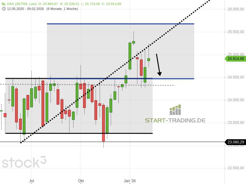 Der Ausblick lässt naheliegenderweise auf sinkende Kurse schließen. Wahrscheinlich ist, dass der DAX nachgibt und den Preisbereich bei 24.550 Punkten erreicht. Unterhalb der blauen Unterstützungslinie fällt der Index auch bis 24.400 Punkte. Interessant dabei: Der DAX wäre in diesem Fall wieder in den ehemaligen, monatelang andauernden Seitwärtskanal zurückgefallen, was klar als Schwäche interpretiert werden wird.