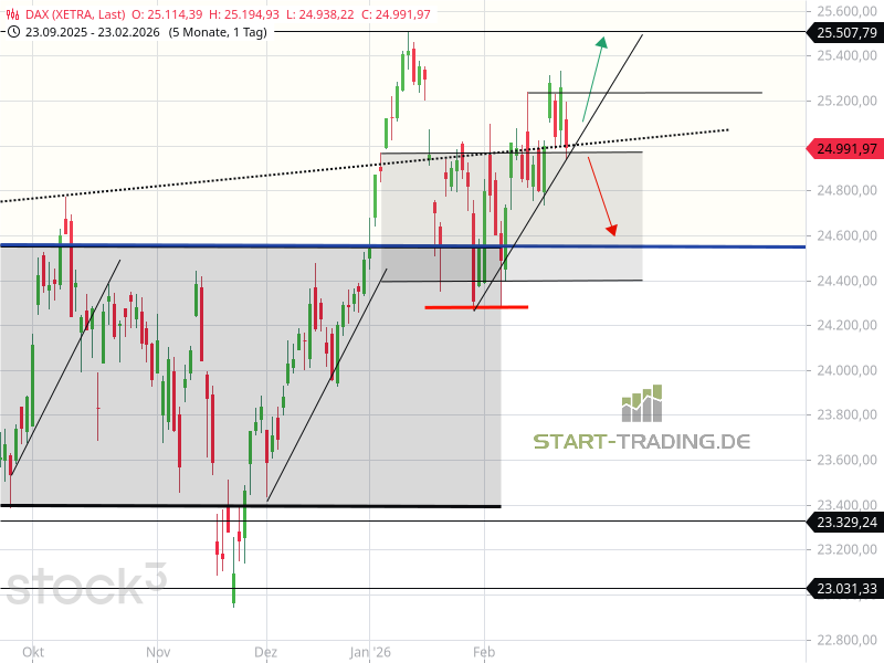 Sinkt der DAX unter 24.938 Punkte, ist die Richtungsentscheidung gefallen, und der Index orientiert sich dauerhaft nach Süden (roter Pfeil). Das erste Kursziel lautet dann 24.570 Punkte.
