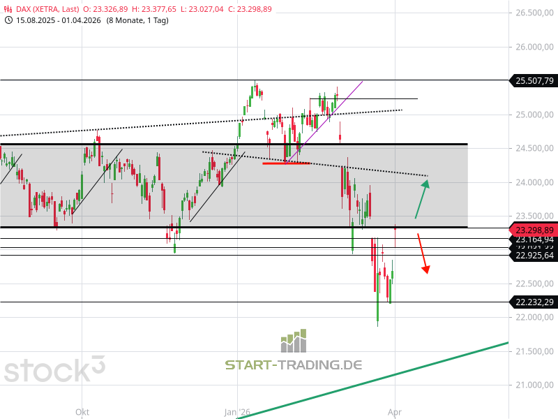 Kann der DAX über 23.330 Punkte notieren, hat er börsentechnisch das Gröbste hinter sich, und ein Hauch von Normalität würde durch die Börsen wehen. Das Störfeuer „Iran-Krieg“ wäre aus den Köpfen der Anleger, und sie würden sich wieder auf steigende Kurse konzentrieren. Diese Sichtweise ist zwar kurz gedacht, da sich die Folgen des Öl- und Gasmangels noch weiter in den Preisen und der Inflation zeigen werden, aber für den Moment wollen die Anleger Wertpapiere kaufen. Oberhalb von 23.300 Punkten hat der Index Platz bis 23.502 Punkte und darüber bis 23.950 Punkte. Kann der DAX die Marke bei 23.330 Punkten nicht überwinden, werden die Kurse wieder den Rückwärtsgang einlegen. In diesem Fall ist ein Kursrückgang bis 22.680 Punkte wahrscheinlich.