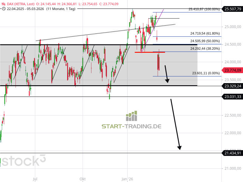 Fällt der DAX unter 23.330 Punkte, sollten sofort alle Alarmzeichen angehen. Riskant! Dann hätte der Index die untere Begrenzungslinie des angesprochenen Seitwärtskanals verlassen. Eine letzte Unterstützung befindet sich noch bei 22.943 Punkten, die wohl nicht die Kraft haben wird, eine dann entstehende Verkaufswelle zu bremsen. Unterhalb von 22.943 Punkten sind alle Würfel gefallen, und der DAX eröffnet sich daraufhin Abwärtspotenzial bis 21.500 Punkte. Diese Fallhöhe gilt es zu beachten.