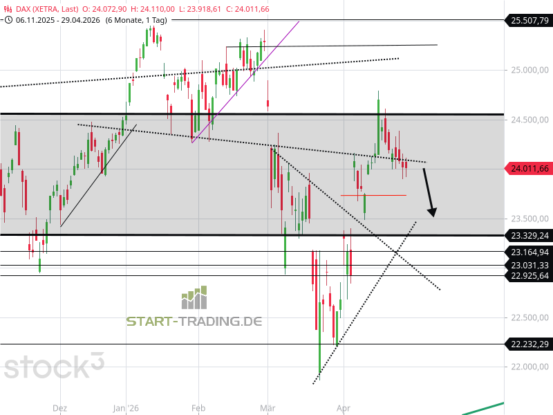 Der deutsche Aktienindex ist dabei, die Zwischenrallye im April 2026 zu verarbeiten. Trotz aller geopolitischen Auseinandersetzungen im Nahen Osten sind die Börsenkurse gestiegen. Wie das obige Chartbild zeigt, ist der Index nach dem Ausflug zu 24.700 Punkten wieder zurück in seinem Seitwärtskanal. Sofern nicht eine überraschende Meldung „Deal mit dem Iran“ die Runde macht, ist der Index auf dem Weg zu 23.500 Punkten. Die untere Begrenzungslinie des Seitwärtskanals befindet sich bei 23.300 Punkten.