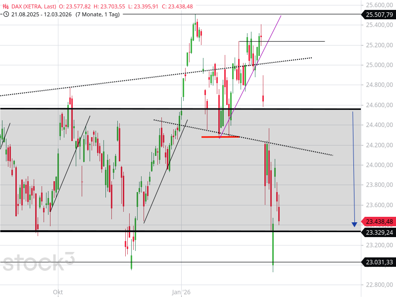 Es könnte aber auch anders kommen. Dann wären die letzten Tage die Ruhe vor dem Sturm. Der DAX nähert sich wieder der unteren Linie bei 23.330 Punkten an. Wenn diese nicht gehalten wird, wird es brenzlig am Aktienmarkt, weil dann die Fallhöhe für den DAX sehr hoch ist. Wir begleiten die weitere Bewegung mit Trading-Signalen (mehr erfahren).