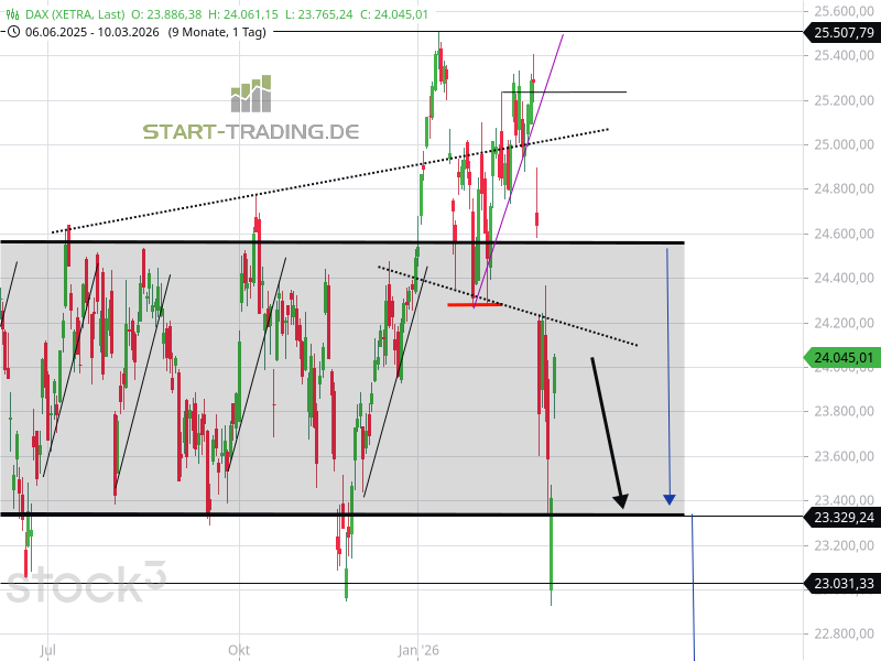 Ob nun ein Kriegsende bevorsteht, ist jedoch ungewiss. 1.000 DAX-Punkte sind jedoch eingepreist, und nun heißt es Daumendrücken. Der Index konnte sich mit dem gestrigen Kraftakt innerhalb des wichtigen Seitwärtskanals halten. Das ist positiv zu werten. Heute kann sich der Index zurück zur Mitte des Trendkanals bewegen.