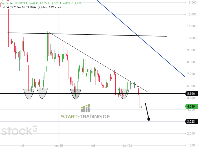 Die Evotec-Aktie fällt in der letzten Zeit deutlich und enttäuscht die Anleger, die die Daumen gedrückt haben. Für einen Moment sah es tatsächlich so aus, als könne ein Boden gefunden werden, ein Ende des Abverkaufs lag in der Luft. Dann kam der Iran-Krieg und brachte Kursverluste an den Börsen. Daraufhin gab die Evotec-Aktie den wichtigen Supportbereich auf. Jetzt ist die Hälfte des Weges geschafft, die andere Hälfte wird folgen.