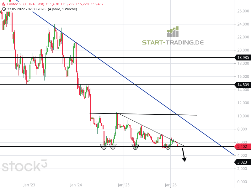 Der heutige Tag ist absolut entscheidend für die Evotec-Aktie. Kann sich der Aktienkurs nach einer schwachen Handelseröffnung stabilisieren und den Tag über 5,40 Euro schließen, wäre das Schlimmste abgewendet, da dann die Verteidigung der Unterstützungslinie gelungen wäre. Viel Konjunktiv für die Anleger. Der Abschluss des Tages wird für Klarheit sorgen.