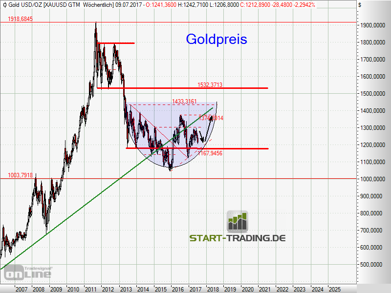 Eigentlich hatte sich der Goldpreis im Jahre 2016 in eine gute Ausgangsposition gebracht. Er konnte aus einem fallenden Keil ausbrechen und stieg in der Folge steil an. Dabei gelang es dem Edelmetall, auch die grüne steigende Trendlinie in der Bildmitte zu übersteigen. Damit waren alle Vorzeichen auf eine Fortsetzung des Anstiegs richtiggestellt. Doch es sollte anders kommen.