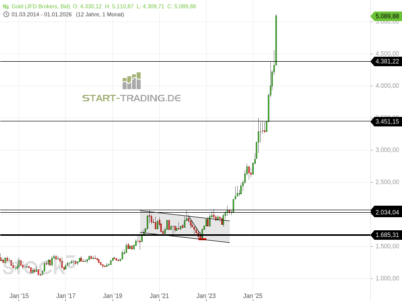 Eine Abkühlung wird kommen, doch das „Wann“ ist nicht aus dem Chart abzuleiten. Es gibt kaum Orientierungsmarken, keine Hochs und Tiefs, keine Unterstützungslinien und keine Widerstände. Ein Kursrückgang könnte problemlos bis 4.380 US-Dollar gehen, ohne dass sich an den positiven Aussichten etwas verändert. Bisher gibt es noch keine Anzeichen für eine Abkühlung.