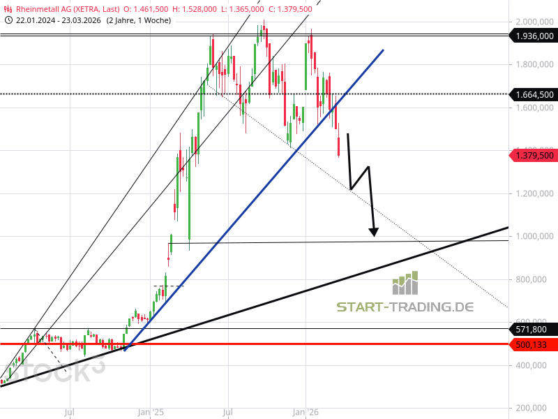 Der Trendbruch bei der Rheinmetall-Aktie hatte sich angekündigt. Nach dem Verlassen des Aufwärtstrends waren die Würfel bei diesem Wert gefallen. Anleger, die die Veränderung im Chartbild erkannt haben, reagierten zuerst. Schnell wurden Aktien verkauft und die Gewinne gesichert. Der Aktienkurs fällt nun deutlich. Die weitere Richtung ist abwärts. Zwei Kursziele lassen sich ableiten.