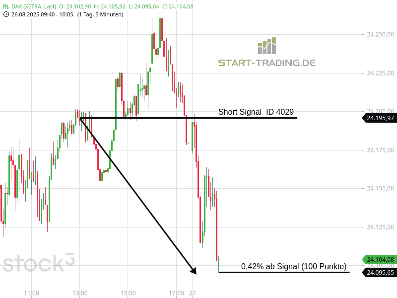 Signal ID 4029 von start-trading.de | 27 Aug., 2025 | Signal Signal-ID: 4029 Signal: DAX Short Stand: 24.195 Zeit: 26.08.2025 – 13:03 Uhr Mindestgewinn: 73 Punkte Maximal möglicher Gewinn: 100 Punkte Wertung: Dieses Signal war erfolgreich Wir freuen uns, auch Ihnen unsere DAX-Signale zur Verfügung zu stellen. Unser Service – Ihr Erfolg Ähnliche Artikel zu diesem Thema: Signal ID 3937 Signal ID 3909 Signal ID 3884 Signal ID 2025