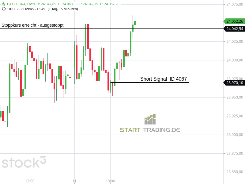 Signal ID 4067 von start-trading.de | 11 Nov., 2025 | Signal Signal-ID: 4067 Signal: DAX Short Stand: 23.970 Zeit: 11.11.2025 – 13:14 Uhr Stopp-Loss-Marke: 24.042 Verlust: 72 Punkte Wertung: Dieses Signal war erfolglos Ähnliche Artikel zu diesem Thema: Signal ID 4048 Signal ID 3995 Signal ID 3924 Signal ID 3890