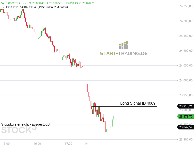Signal ID 4069 von start-trading.de | 16 Nov., 2025 | Signal Signal-ID: 4069 Signal: DAX Long Stand: 23.913 Zeit: 14.11.2025 – 09:12 Uhr Stopp-Loss-Marke: 23.841 Verlust: 73 Punkte Wertung: Dieses Signal war erfolglos Ähnliche Artikel zu diesem Thema: Signal ID 3995 Signal ID 3957 Signal ID 3905 Signal ID 3900