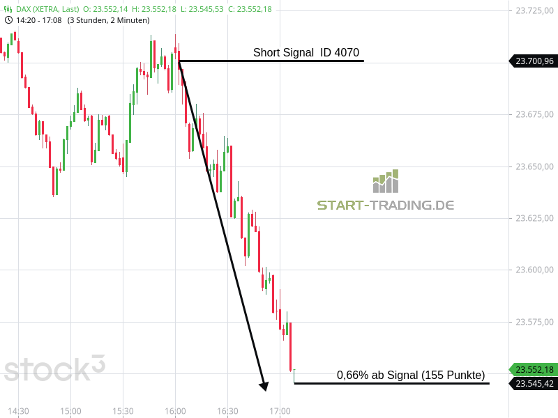 Signal ID 4070 von start-trading.de | 17 Nov., 2025 | Signal Signal-ID: 4070 Signal: DAX Short Stand: 23.700 Zeit: 17.11.2025 – 16:03 Uhr Mindestgewinn: 71 Punkte Maximal möglicher Gewinn: 155 Punkte Wertung: Dieses Signal war erfolgreich Wir freuen uns, auch Ihnen unsere DAX-Signale zur Verfügung zu stellen. Unser Service – Ihr Erfolg Ähnliche Artikel zu diesem Thema: Signal ID 4051 Signal ID 3937 Signal ID 3878 Signal ID 2025