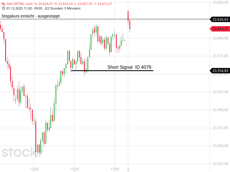 Signal ID 4079 von start-trading.de | 2 Dez., 2025 | Signal Signal-ID: 4079 Signal: DAX Short Stand: 23.554 Zeit: 01.12.2025 – 14:53 Uhr Stopp-Loss-Marke: 23.625 Verlust: 71 Punkte Wertung: Dieses Signal war erfolglos Ähnliche Artikel zu diesem Thema: Signal ID 4063 Signal ID 3995 Signal ID 3899 Signal ID 3894