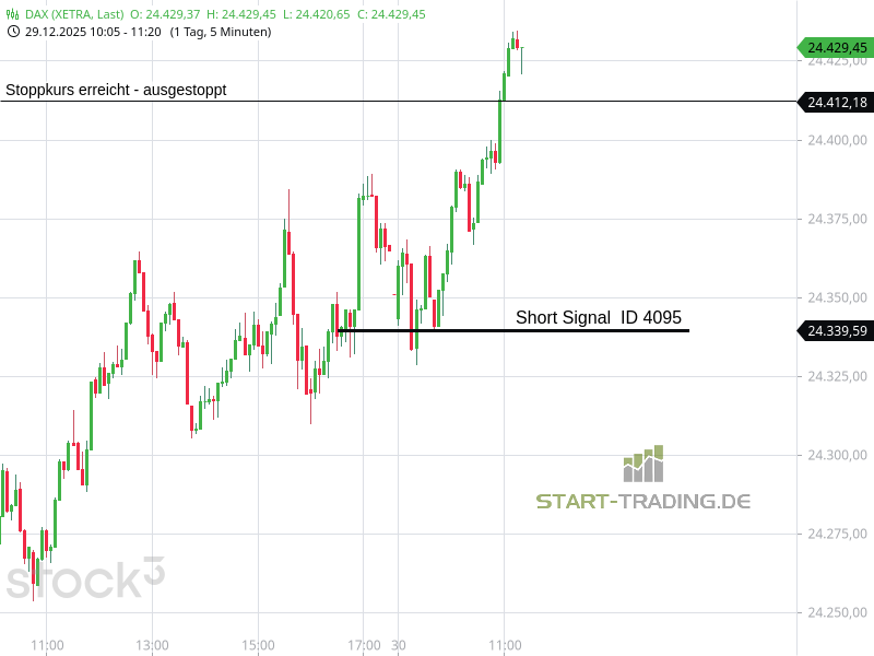 Signal ID 4095 von start-trading.de | 2 Jan., 2026 | Signal Signal-ID: 4095 Signal: DAX Short Stand: 24.339 Zeit: 29.12.2025 – 16:33 Uhr Stopp-Loss-Marke: 24.412 Verlust: 73 Punkte Wertung: Dieses Signal war erfolglos Ähnliche Artikel zu diesem Thema: Signal ID 4079 Signal ID 4054 Signal ID 4012 Signal ID 3995