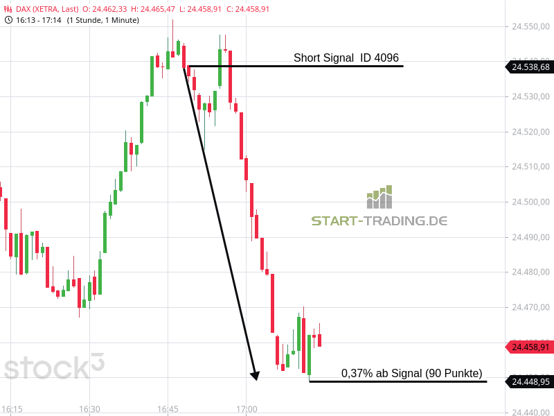 Signal ID 4096 von start-trading.de | 4 Jan., 2026 | Signal Signal-ID: 4096 Signal: DAX Short Stand: 24.538 Zeit: 02.01.2026 – 16:49 Uhr Mindestgewinn: 74 Punkte Maximal möglicher Gewinn: 91 Punkte Wertung: Dieses Signal war erfolgreich Wir freuen uns, auch Ihnen unsere DAX-Signale zur Verfügung zu stellen. Unser Service – Ihr Erfolg Ähnliche Artikel zu diesem Thema: DAX-Ausblick: Abkühlung steht bevor Signal ID 4095 Signal ID 2026 Signal ID 1373