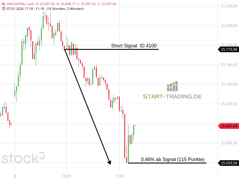Signal ID 4100 von start-trading.de | 9 Jan., 2026 | Signal Signal-ID: 4100 Signal: DAX Short Stand: 25.173 Zeit: 08.01.2026 – 09:58 Uhr Mindestgewinn: 75 Punkte Maximal möglicher Gewinn: 115 Punkte Wertung: Dieses Signal war erfolgreich Wir freuen uns, auch Ihnen unsere DAX-Signale zur Verfügung zu stellen. Unser Service – Ihr Erfolg Ähnliche Artikel zu diesem Thema: Signal ID 4098 Signal ID 4097 Signal ID 4096 Signal ID 2026