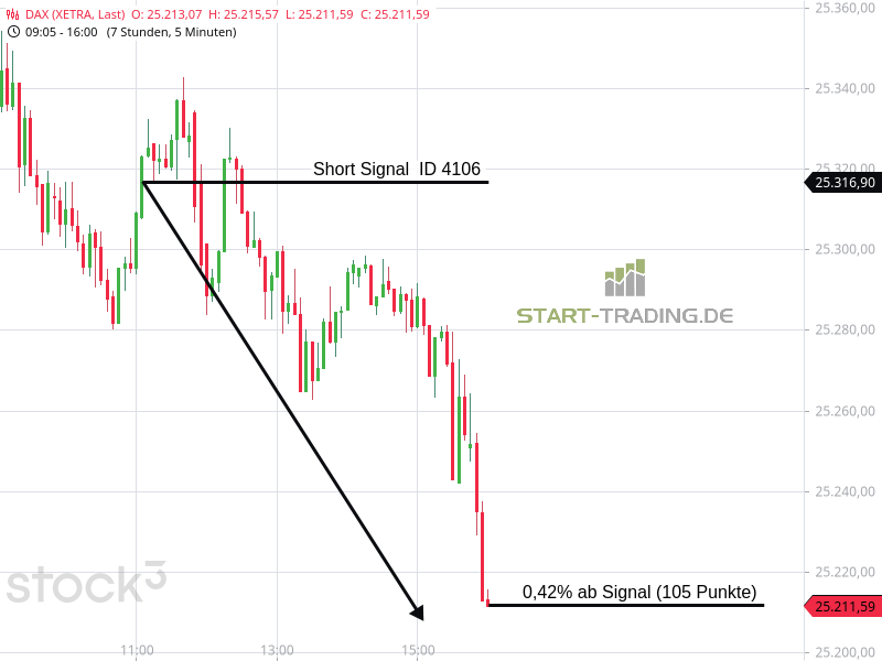 Signal ID 4106 von start-trading.de | 17 Jan., 2026 | Signal Signal-ID: 4106 Signal: DAX Short Stand: 25.316 Zeit: 16.01.2026 – 11:08 Uhr Mindestgewinn: 76 Punkte Maximal möglicher Gewinn: 105 Punkte Wertung: Dieses Signal war erfolgreich Wir freuen uns, auch Ihnen unsere DAX-Signale zur Verfügung zu stellen. Unser Service – Ihr Erfolg Ähnliche Artikel zu diesem Thema: Signal ID 4100 Signal ID 4097 Signal ID 4096 Signal ID 2026
