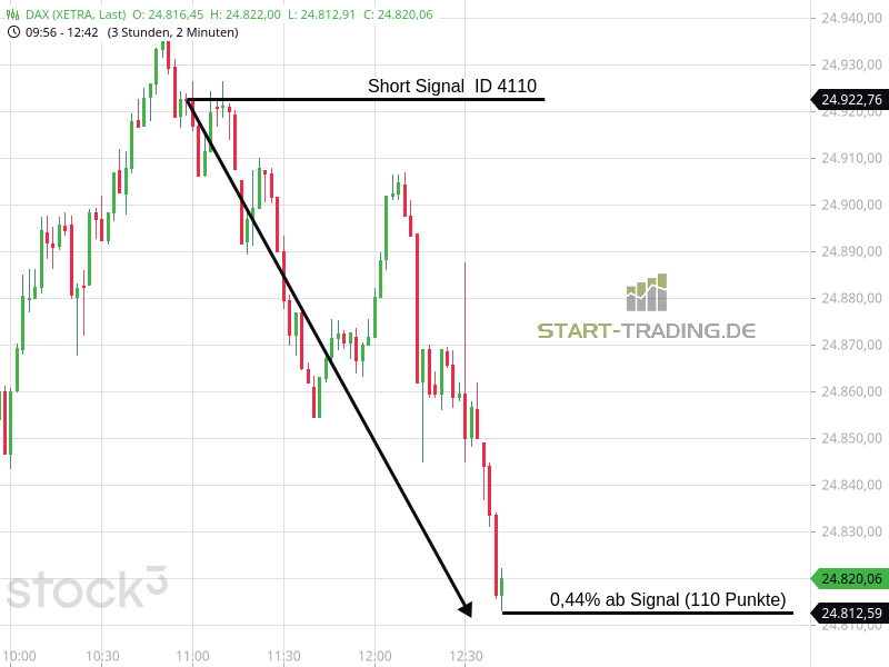 Signal ID 4110 von start-trading.de | 22 Jan., 2026 | Signal Signal-ID: 4110 Signal: DAX Short Stand: 24.922 Zeit: 22.01.2026 – 10:58 Uhr Mindestgewinn: 75 Punkte Maximal möglicher Gewinn: 110 Punkte Wertung: Dieses Signal war erfolgreich Wir freuen uns, auch Ihnen unsere DAX-Signale zur Verfügung zu stellen. Unser Service – Ihr Erfolg Ähnliche Artikel zu diesem Thema: Signal ID 4106 Signal ID 4097 Signal ID 4096 Signal ID 2026