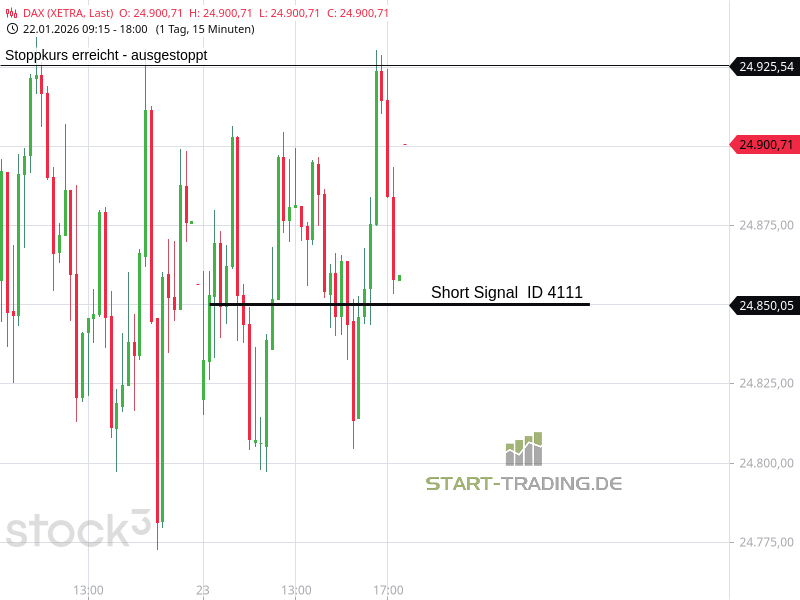 Signal ID 4111 von start-trading.de | 26 Jan., 2026 | Signal Signal-ID: 4111 Signal: DAX Short Stand: 24.850 Zeit: 23.01.2026 – 09:27 Uhr Stopp-Loss-Marke: 24.925 Verlust: 75 Punkte Wertung: Dieses Signal war erfolglos Ähnliche Artikel zu diesem Thema: Signal ID 4108 Signal ID 4105 Signal ID 4104 Signal ID 4095