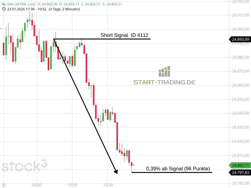 Signal ID 4112 von start-trading.de | 26 Jan., 2026 | Signal Signal-ID: 4112 Signal: DAX Short Stand: 24.893 Zeit: 26.01.2026 – 09:45 Uhr Mindestgewinn: 75 Punkte Maximal möglicher Gewinn: 96 Punkte Wertung: Dieses Signal war erfolgreich Wir freuen uns, auch Ihnen unsere DAX-Signale zur Verfügung zu stellen. Unser Service – Ihr Erfolg Ähnliche Artikel zu diesem Thema: Signal ID 4110 Signal ID 4109 Signal ID 4100 Signal ID 2026
