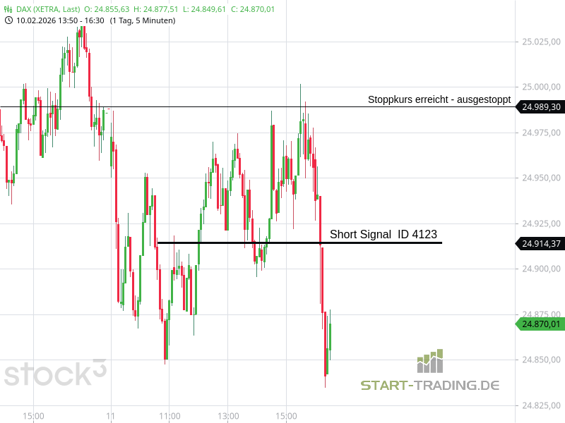 Signal ID 4123 von start-trading.de | 11 Feb., 2026 | Signal Signal-ID: 4123 Signal: DAX Short Stand: 24.914 Zeit: 11.02.2026 – 10:37 Uhr Stopp-Loss-Marke: 24.989 Verlust: 75 Punkte Wertung: Dieses Signal war erfolglos Ähnliche Artikel zu diesem Thema: Signal ID 4120 Signal ID 4117 Signal ID 4111 Signal ID 4108