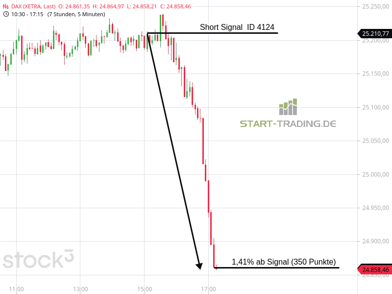Signal ID 4124 von start-trading.de | 12 Feb., 2026 | Signal Signal-ID: 4124 Signal: DAX Short Stand: 25.210 Zeit: 12.02.2026 – 15:09 Uhr Mindestgewinn: 76 Punkte Maximal möglicher Gewinn: 350 Punkte Wertung: Dieses Signal war erfolgreich Wir freuen uns, auch Ihnen unsere DAX-Signale zur Verfügung zu stellen. Unser Service – Ihr Erfolg Ähnliche Artikel zu diesem Thema: Signal ID 4110 Signal ID 4106 Signal ID 4096 Signal ID 2026