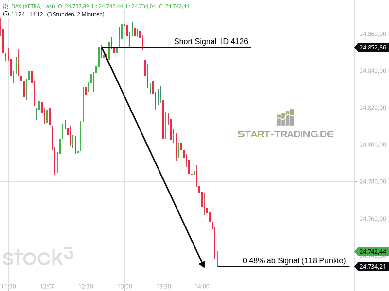 Signal ID 4126 von start-trading.de | 17 Feb., 2026 | Signal Signal-ID: 4126 Signal: DAX Short Stand: 24.852 Zeit: 17.02.2026 – 12:42 Uhr Mindestgewinn: 75 Punkte Maximal möglicher Gewinn: 118 Punkte Wertung: Dieses Signal war erfolgreich Wir freuen uns, auch Ihnen unsere DAX-Signale zur Verfügung zu stellen. Unser Service – Ihr Erfolg Ähnliche Artikel zu diesem Thema: Signal ID 4124 Signal ID 4119 Signal ID 4116 Signal ID 2026
