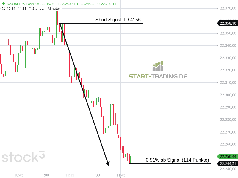Signal ID 4156 von start-trading.de | 30 März, 2026 | Signal Signal-ID: 4156 Signal: DAX Short Stand: 22.358 Zeit: 30.03.2026 – 11:09 Uhr Mindestgewinn: 67 Punkte Maximal möglicher Gewinn: 114 Punkte Wertung: Dieses Signal war erfolgreich Wir freuen uns, auch Ihnen unsere DAX-Signale zur Verfügung zu stellen. Unser Service – Ihr Erfolg Ähnliche Artikel zu diesem Thema: Signal ID 4143 Signal ID 4140 Signal ID 4113 Signal ID 2026