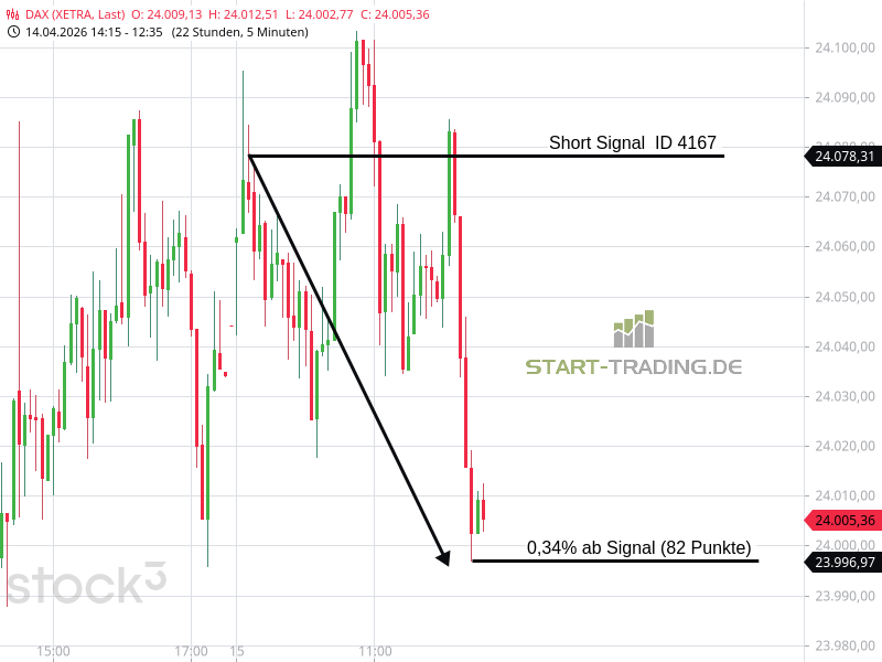 Signal ID 4167 von start-trading.de | 15 Apr., 2026 | Signal Signal-ID: 4167 Signal: DAX Short Stand: 24.078 Zeit: 15.04.2026 – 09:12 Uhr Mindestgewinn: 74 Punkte Maximal möglicher Gewinn: 82 Punkte Wertung: Dieses Signal war erfolgreich Wir freuen uns, auch Ihnen unsere DAX-Signale zur Verfügung zu stellen. Unser Service – Ihr Erfolg Ähnliche Artikel zu diesem Thema: Signal ID 4124 Signal ID 4119 Signal ID 4116 Signal ID 2026